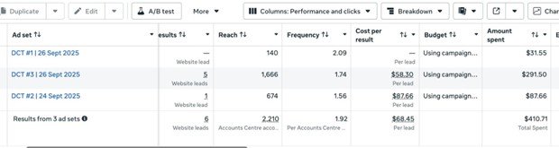 The first phase drove traffic to a dedicated landing page. Three ad sets were tested across different audiences, spending $410.71 in total. Only 6 website leads came in at an average of $68.45 per lead — and quality was inconsistent. This wasn’t a failure; it was a deliberate testing phase that told us exactly what to do next.