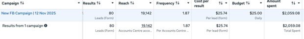 Campaign 1 — Facebook Lead Form Results (Nov 2025):