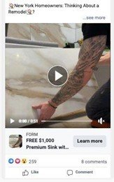 The combination of a strong hook (targeting NY homeowners thinking about a remodel), a high-value offer (free premium sink), and genuine video footage of completed projects created ads that felt credible — not salesy.