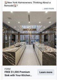 All ads targeted New York homeowners actively thinking about a remodel. The creative angle — a free $1,000 premium sink with their kitchen remodel — gave people a compelling, tangible reason to reach out immediately. Video ads showing real project footage performed best, giving the ads an authentic, trustworthy feel.